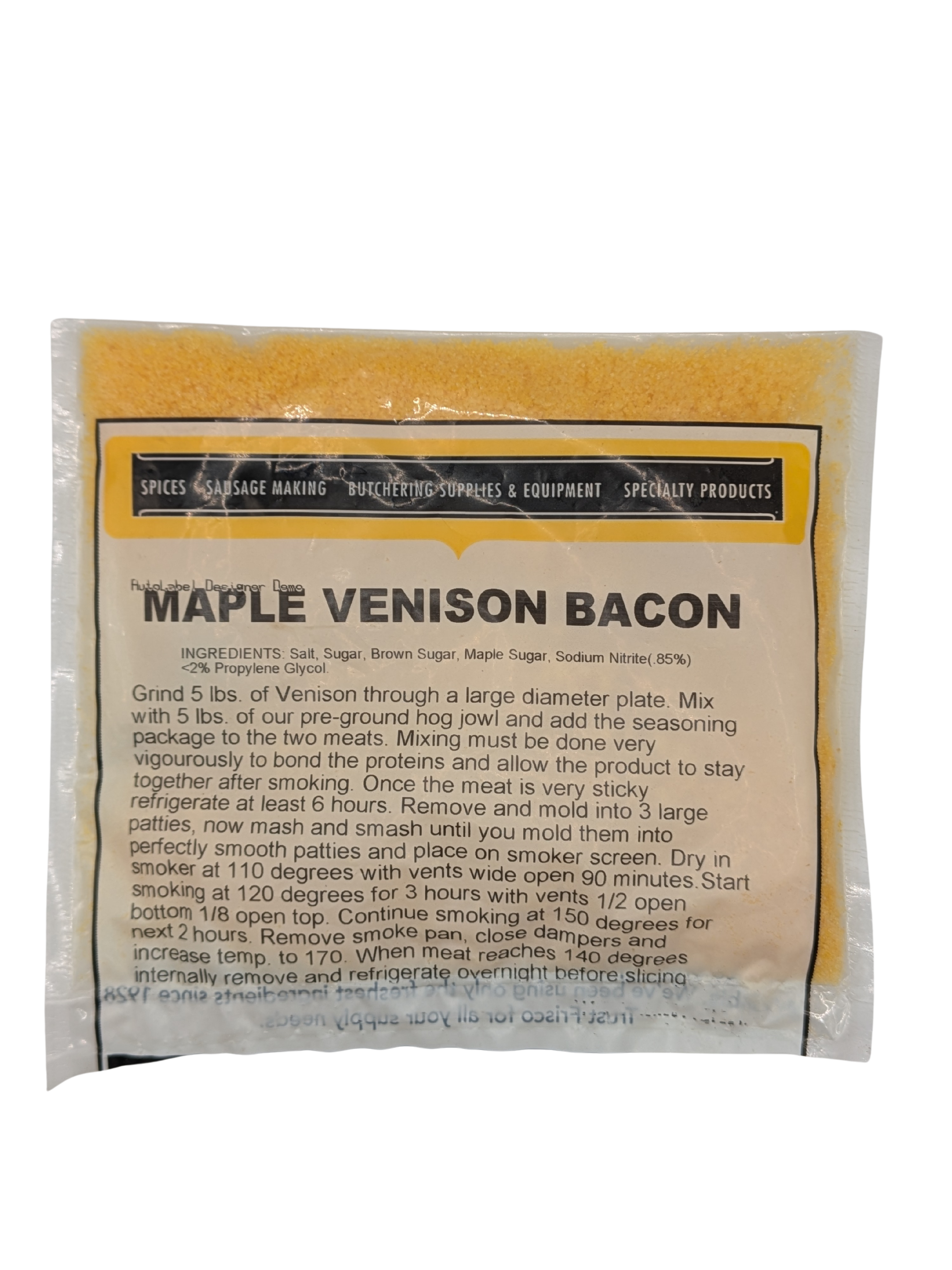 Transform your pork into a gourmet delight with Frisco Brand's Maple Bacon Cure. This cure is a perfect blend of natural maple flavor and traditional curing ingredients, creating a sweet, savory, and slightly smoky taste that's irresistible in homemade bacon. Whether you're an experienced charcutier or trying bacon curing for the first time, this maple bacon cure makes the process simple and rewarding. Perfect for curing pork belly or loin, it infuses the meat with a rich, complex flavor that's ideal for a special breakfast, a delicious BLT, or any dish that calls for a touch of bacon luxury.