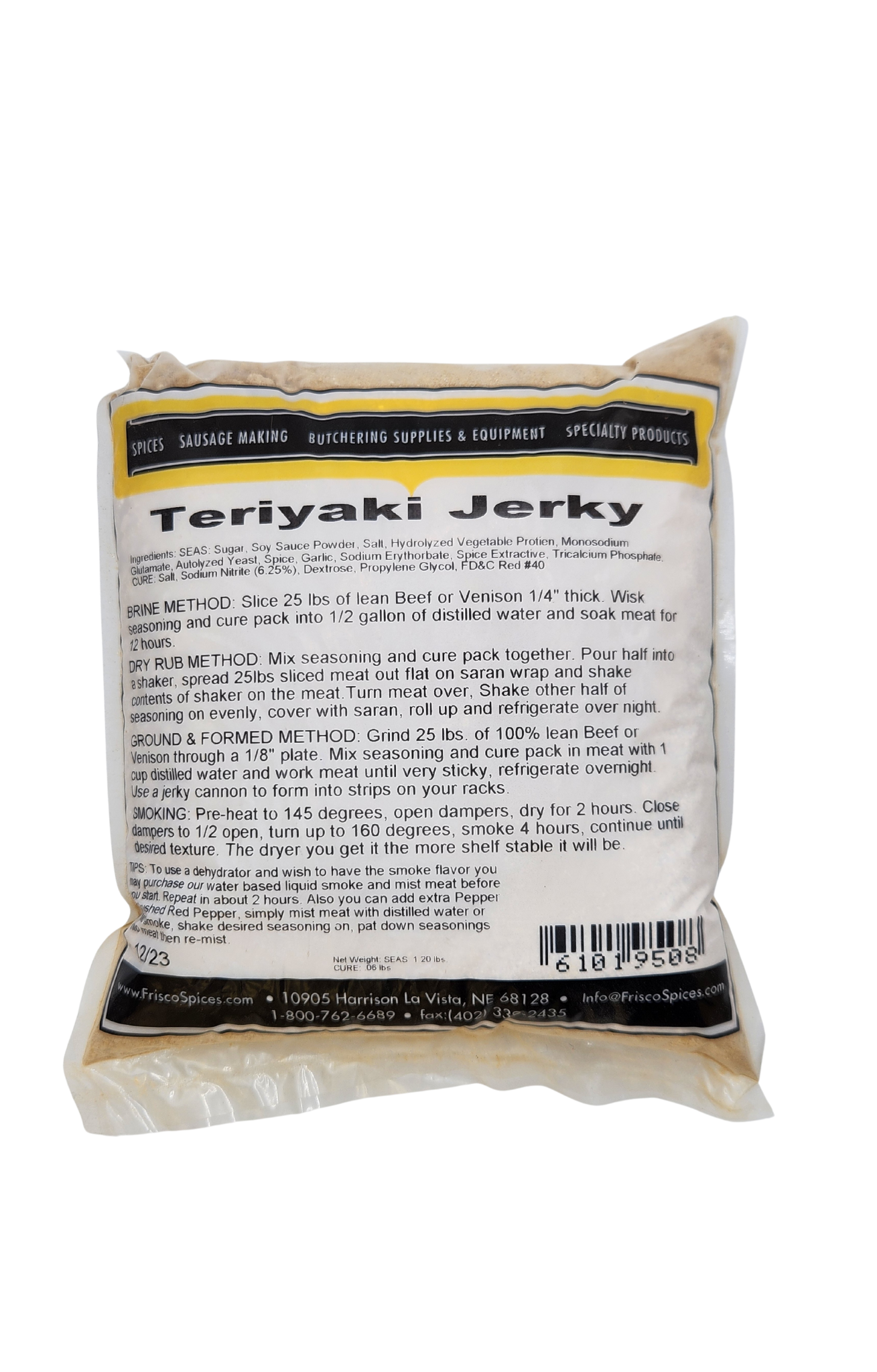 Embark on a flavorful adventure with Frisco Brand's Teriyaki Jerky Seasoning. This seasoning is a perfect fusion of traditional Japanese teriyaki flavors, blending sweet, savory, and a hint of garlic and ginger. Crafted for jerky enthusiasts, this blend will transform your beef, pork, poultry, or game into an irresistibly delicious snack. Ideal for those who appreciate a sweet and savory jerky with a gentle Asian twist. Whether you're a seasoned jerky maker or just starting out, Frisco Brand's Teriyaki Jerky Seasoning is sure to add an exotic flair to your homemade jerky.